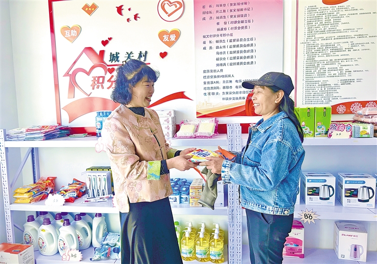 在城关村,村民杨小芳将捡拾的残膜交到回收点换取积分,兑换生活用品。“地膜留在地里污染环境,大家都积极配合回收。”杨小芳说。