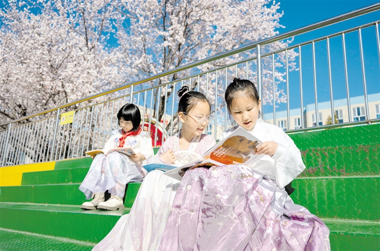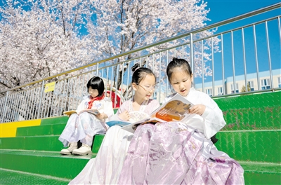 4月1日,在呼和浩特市赛罕区大学路小学第三届校园桃花节活动现场,淘换到心仪图书的学生们正在桃树下阅读。当日,该校举办的第三届校园桃花节不仅为师生呈现了精彩纷呈的社团表演,还特别增设了充满烟火气的“桃花书市”,让孩子们在烂漫春色中体验了一场别样的文化之旅。 本报记者 王磊 摄