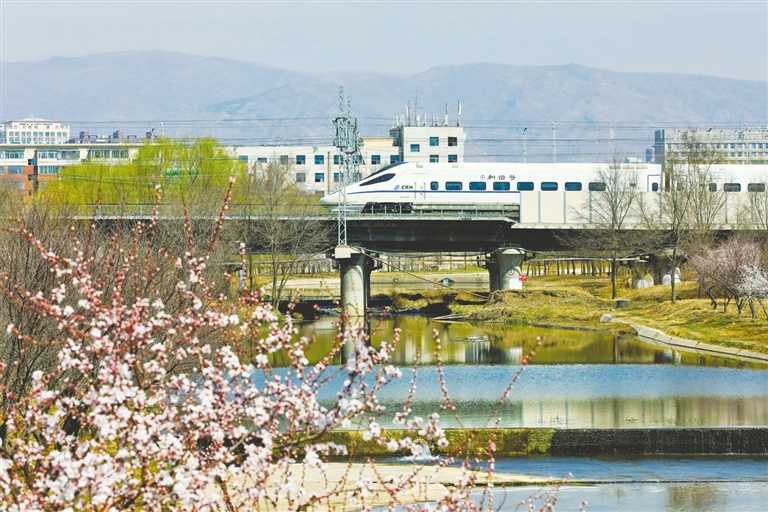 4月2日,和谐号动车组列车行驶在呼和浩特市境内京包客运专线上。清明节假期临近,中国铁路呼和浩特局集团有限公司加大运能供给,加开多趟旅客列车,全力提升客运能力,满足广大旅客清明节假期出行需求。本报记者 马骏驰 摄