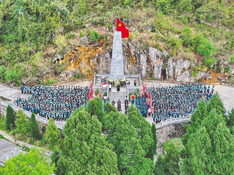 3月31日,贵州省遵义市播州区尚嵇中学的师生在茶山关烈士陵园开展祭奠活动(无人机照片)。清明节前夕,全国多地通过各种形式缅怀英烈,致敬英雄。新华社发