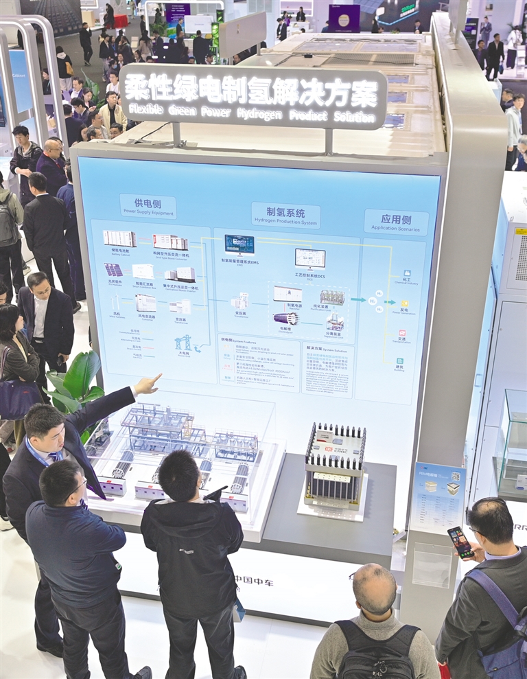 4月2日,参观者在第十四届储能国际峰会暨展览会上了解中国中车的柔性绿电制氢解决方案。第十四届储能国际峰会暨展览会3月31日至4月3日在北京首都国际会展中心举行。本届峰会以“场景创新 价值重构 全球共赢”为主题,展览会设立六大主题展馆。 新华社记者 尹栋逊 摄