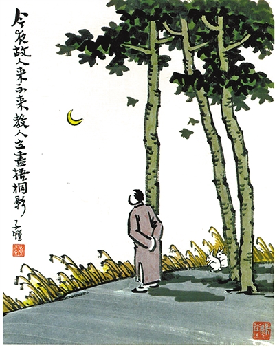 与“情境”性直接相关的,是可以想见的“情境延展”性,亦即近似叙事作品中的情节性。丰子恺的漫画皆源于其生活中的独到发现与感性生发,有的虽然以中国古代诗词佳句做画题,但画面表现的则多为现实生活“相”。从画面上看,一幅画作所表现的情境是孤立的、静态的,但是,推想其创作经历,即从观察生活、激发灵感、艺术构思,到将画面呈现于纸上,是一个把“世间万象引人注目的”(丰子恺语)事情或状态提取出来的过程。而这“世间万象”中的事情或状态,不是“孤立”的,通常有其形成、发展,或变化的原因及必然性或可然性,这便是艺术中的情节性元素。丰子恺的许多漫画作品内含情节性元素,让人看后自然而然地产生联想和想象,由一幅孤立、静态的画作想见可延展的情境及内在的故事。如《绿酒一卮红上面》《得其所哉,得其所哉》《海内存知己,天涯若比邻》《百年笑口几回开》《春光先到野人家》《绿杨芳草》《今夜故人来不来,教人立尽梧桐影》《三杯不记主人谁》《散市》《六六水窗通》《月上柳梢头》《且推窗看中庭月,影过东墙第几砖》《落红不是无情物,化作春泥更护花》等。《今夜故人来不来,教人立尽梧桐影》,取自唐人吕岩《梧桐影·落日斜》中的诗句,悟其境界而作。此作表现一个等待者用心之诚,盼望之切。画面上三株梧桐树壮硕参天,远处一弯上玄月静悬天际,等待者立于梧桐树旁,神情专注地面向远方——定是“故人”该来的方向。地面上已经枯黄的野草因风吹而倾侧,上有几片正在飘落的梧桐叶与之呼应。其时令当属某一个秋夜。这幅“孤立”画面呈现出一个有意味的情境,或可称之曰“秋夜等待图”。这“等待”即内含了故事:他所等待的“故人”到底是何人?那人的到来,是否提前有约?等待者此时心情如何?等等。甚至让人代那“等待者”心急,禁不住心中默叹:“他怎么还不来!”观画者随着这些故事元素所触动的审美关切通过联想与想象再度创作,则使画作的情境性与艺术内涵得到丰富与延展。吸引观画者参与“再创作”,实现故事情境的延展,是丰子恺许多漫画的艺术魅力之一。从这个意义上说,他的许多漫画都内含着可细品、可延伸的话题。
