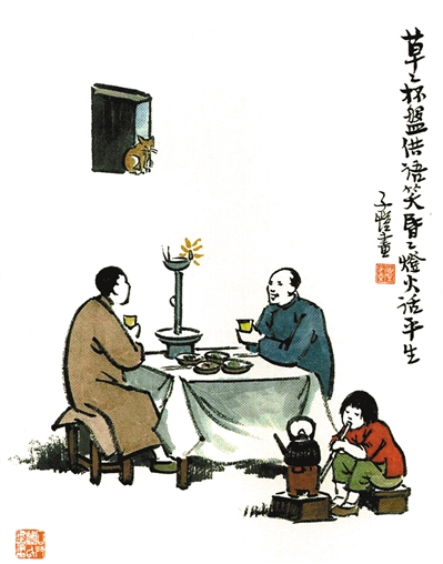读丰子恺的许多漫画作品,往往首先被其“情境”性所吸引。所谓“情境”性,是艺术表现中的“规定情境”,中国的戏曲艺术尤其讲究之,扩而大之,有点近乎所谓“典型环境”。若单单从静态的、平面化的感觉看,某种可视的情境(场面)设置,对于漫画而言,显然并非难题。难的是使处于静态的二维空间上的情境“活”起来,并且有故事性的意味。丰子恺是成功的实践者。这与他对每幅作品的巧妙构思与传神表达直接相关。如《柳下相逢握手手》,表现在风和日丽的春日里,两个小孩在户外相逢的情景。一个小孩较小,奶奶抱着;另一个较大,爷爷领着。他们迎面相遇,即刻相互喜欢,一个倾身要从奶奶的怀抱中跃下来,另一个要急切挣脱爷爷的双手。他们不约而同地将自己的小手伸向对方。也许他们是相识的玩伴,也许他们只是初次相见,这似乎并不重要,重要的是率性纯真的童心使他们彼此无嫌猜,有真趣。此作整个画面静中写动,人物之间互为关系,构成了一个特定的故事性场景。如《草草杯盘供语笑,昏昏灯下话平生》,描绘好友相见、对面畅谈的场面。一张简陋的餐桌,桌上“草草杯盘”,一盏油灯微光昏昏,一对友人对面而坐,开怀相叙。旁边置一红泥火炉,一个小女孩正在用一根竹管吹火,一幅闲适好玩儿的神情。墙上洞开的小窗口上蹲着一只小猫,正视着屋内的场景——且它本身即成为整个画面场景的一部分。这情境,岂不正是在讲述一个“陋室会友”的故事?读此画作,让我们想到1947年3月郑振铎前往杭州静江路丰子恺的“湖畔小屋”小聚的情景。这是他们十年未见后的相见。正所谓十年离乱后,有幸一相逢。他们在灯下饮酒畅谈,菜肴简单,然谈笑开怀。室内墙壁上挂着数学家苏步青的诗作:“草草杯盘共一欢,莫言柴米话辛酸。春风已绿门前草,且耐余寒放眼看。”丰子恺的确是一位长于在“规定情境”的画幅中讲故事的艺术家。关于这一点,除上述举例之外,还可以从《云霓》《除夕》《还有五里路》《看花携酒去,酒醉插画归》《煨芋如拳欢客尝》《田翁烂醉身如舞,两个儿童策上船》《溪家老妇闲无事,落日呼归白鼻豚》《儿童不知春,问草何故绿》《星期六之夜》等作品见出。