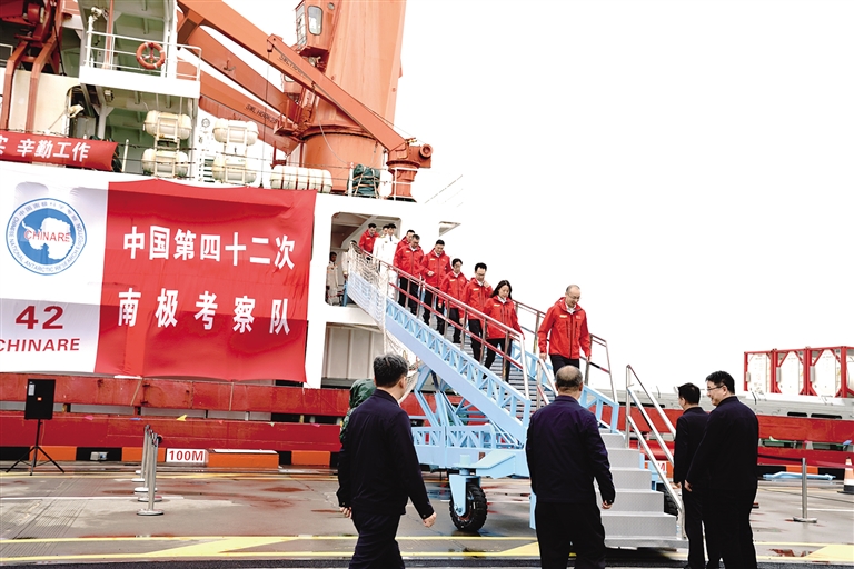 4月9日,中国第42次南极考察队队员走下“雪龙”号。4月9日,历时160天、航程3.4万余海里,执行中国第42次南极考察的“雪龙”号,凯旋归国。550名队员、常规物资补给量超3600吨、内陆考察104天,人员规模和任务量等再创新高;热水钻探刷新世界纪录,国产新装备挺立极寒……这支队伍交出一份中国极地探索能力跃升的答卷。