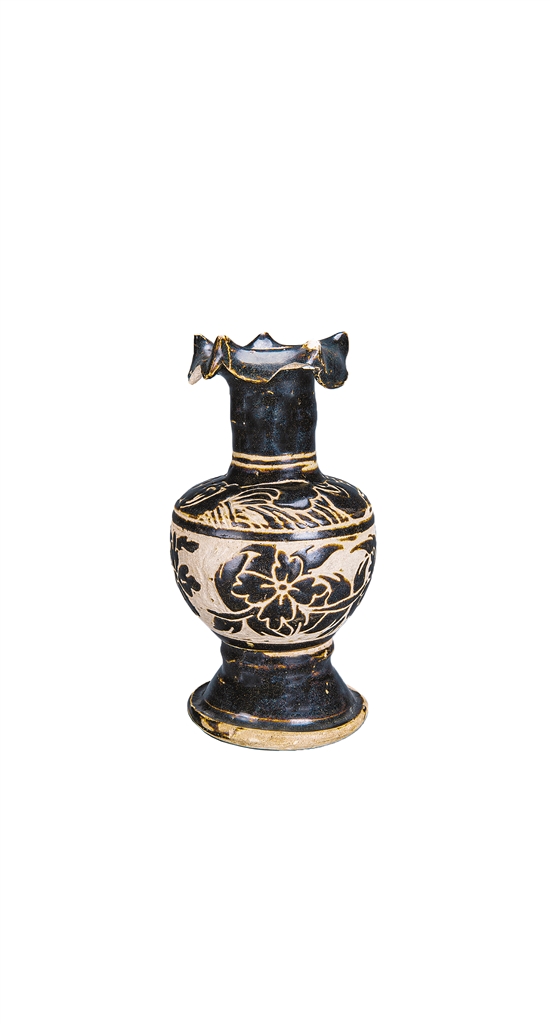 黑釉花瓣口剔花瓷瓶上的装饰以牡丹纹为主。牡丹纹是典型的中原瓷器装饰纹样。自唐代以来,牡丹颇受世人喜爱,有繁荣昌盛、美好幸福的寓意。辽、宋时期,牡丹更是被赋予了“富贵”的象征意义,成为瓷器上不可或缺的装饰元素。