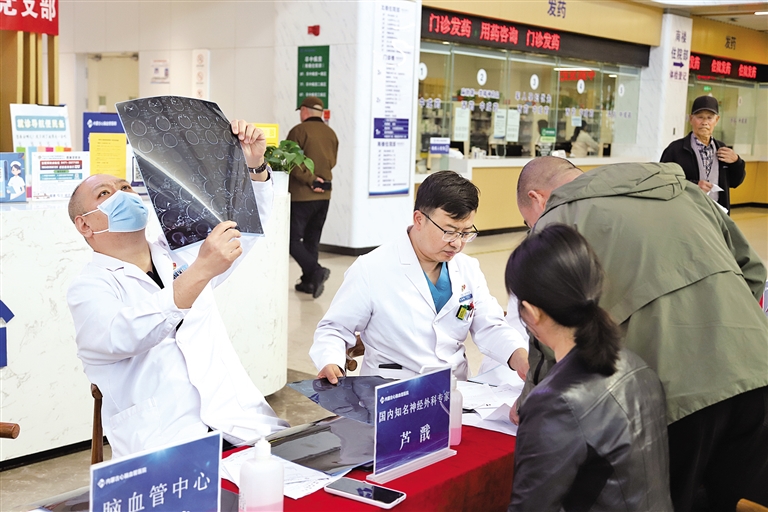 4月11日,医生正在查看患者脑部影像报告。当日是世界帕金森病日,内蒙古心脑血管医院脑血管中心党支部牵头开展专场义诊,为帕金森病患者及家属提供专业健康服务。义诊汇聚区内外专家、医师及临床药师团队,为患者量身定制个性化治疗与管理方案,免费开展筛查测评,普及帕金森病防治知识。本报记者 怀特乌勒斯 摄