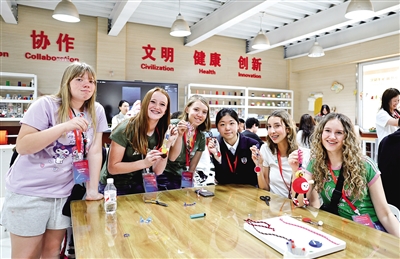 4月11日,美国学生在石家庄外国语学校展示手工课作品。4月11日至12日,“青年之友”中美青少年友好交流暨中美“乒乓外交”55周年纪念活动在河北石家庄举办。应中国人民对外友好协会和河北省人民对外友好协会邀请,朱迪·霍夫罗斯特、康妮·史维利斯和奥尔加·索尔特斯等中美“乒乓外交”亲历者,和来自美国各地的青少年运动员、体育界人士、青年学生以及友好人士代表参加活动。 新华社记者 卢烨 摄