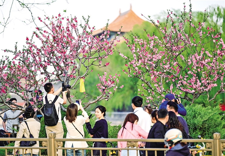 4月11日,游人在北京故宫西北角楼附近拍照。时下,各地春花烂漫,人们纷纷走出家门赏花游园,尽情享受美好春光。 新华社记者 陈晔华 摄