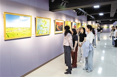 4月12日,市民在巴彦淖尔市河套文艺展厅欣赏参展作品。“天赋河套 美丽葵乡”第六届向日葵摄影展展出来自全国的95幅(组)摄影佳作,涵盖田间劳作场景、自然人文融合、产业发展纪实三大主题。巴彦淖尔市是全国最大的食用向日葵种植基地,常年稳定种植向日葵400余万亩,占自治区50%以上,占全国25%以上,葵花籽成为带动当地农牧民增收的重要产业。本报记者 薛来 摄