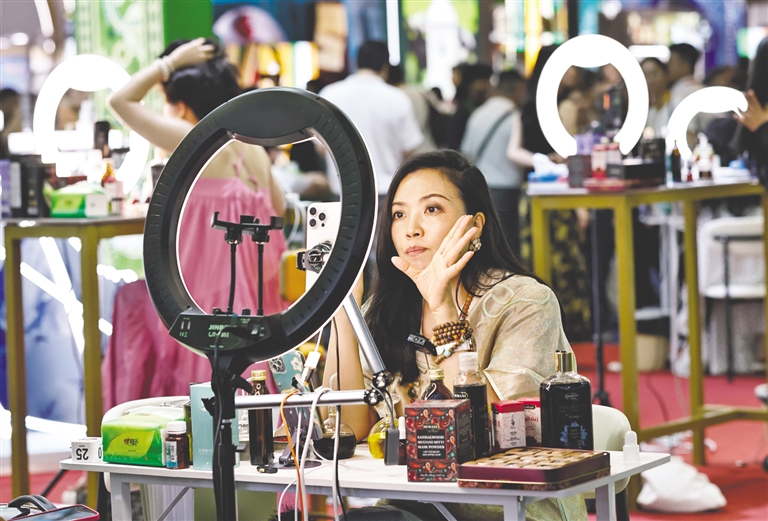 4月13日,主播在第六届消博会的一家化妆品展台直播。当日,第六届中国国际消费品博览会在海南举办。本届展会是海南自贸港全岛封关运作后的首届国家级消费盛会,以“开放引领全球消费,创新驱动美好生活”为主题,汇聚了来自60多个国家和地区的超过3400个品牌参展,搭建起全球消费精品展示交易的国际化平台。 新华社记者 高静 摄