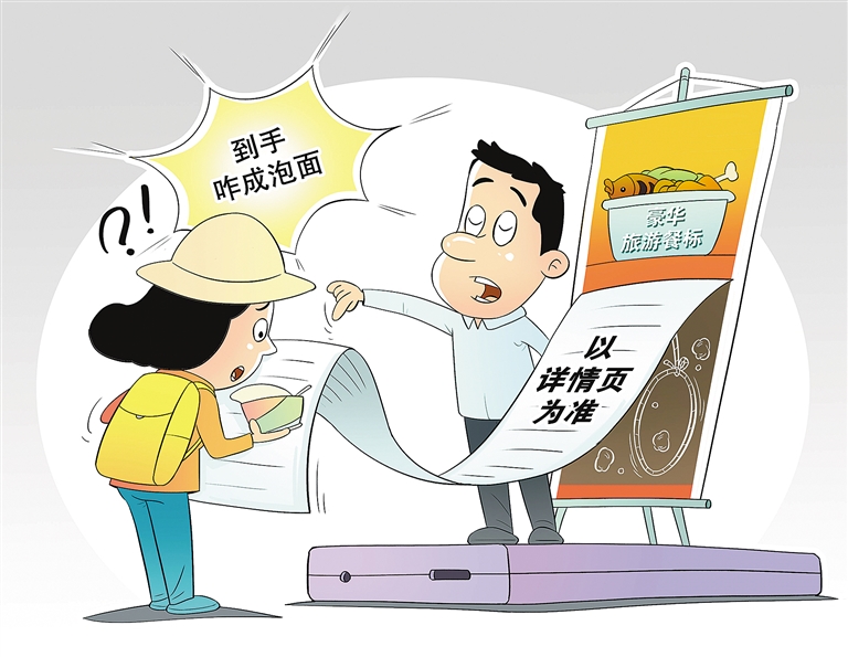 高价餐标变泡面火腿肠、私人定制成拼团游、核销订单时被强制加价……近期,不少消费者反映,在直播间购买的旅游产品存在临时补价、货不对板、退改困难等问题。面对质疑,一些商家以“直播仅供参考,以详情页为准”为由推卸责任,把格式条款作为“挡箭牌”,扰乱文旅市场正常秩序。 王琪 作