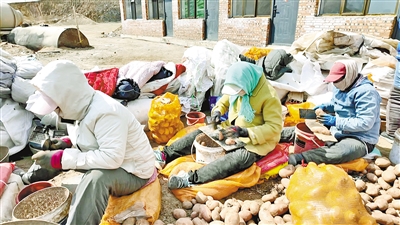 与此同时,朝阳镇民乐村的马铃薯备耕工作也在同步推进。村民们趁着晴好天气加快薯种处理,熟练进行种薯筛选、切块、拌种等工序。村民张万瑞蹲在地上,手里拿着刀,正在切薯块:“这活儿看着简单,其实有讲究,切得太大浪费种子,切得太小出苗不齐。”他边说边示范,刀起刀落,薯块大小几乎一模一样。