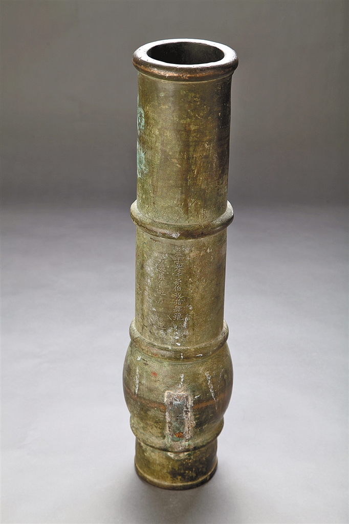 火药是中国古代四大发明之一,管形火器将火药推到更高的位置。在乌兰察布市博物馆“辽——清的乌兰察布”展厅陈列着一件制造于明代永乐年间的铜火铳,口径10厘米,内径7.5厘米,总长度49厘米,重17.7公斤,尾銎(qióng)长5厘米,药室长12厘米,前膛长32厘米。