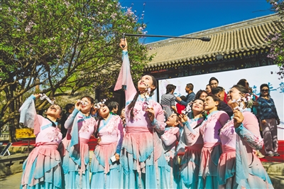 4月18日,内蒙古自治区将军衙署博物院内丁香绽放,景致怡人,丰富有趣的特色互动体验活动同步亮相。游客踏春游园、乐享古韵春光,在游玩体验中近距离感受百年衙署的历史魅力。本报记者 王磊 摄