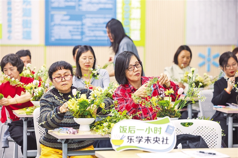 4月20日,在杭州市临平区东湖街道老年学校教室里,社区老年人在上花艺课程。4月20日晚,浙江省杭州市临平区首家老年教育夜校“未央社”在东湖街道老年学校揭牌亮相。首批特色课程设置花艺扦插、婴幼儿辅食制作、老年美妆穿搭、科学膳食营养、短视频直播等,课程均安排在晚饭后的时段,每次1小时左右。该夜校是当地政府部门积极推进老年教育民生实事项目的新举措,填补了临平区夜间老年教育资源空白,为辖区老年群体打造“饭后一小时”的学习平台,助力银发经济发展。 新华社记者 徐昱 摄