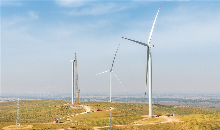 4月22日,华能北方公司金桥和林火力发电灵活性改造配套消纳新能源480兆瓦风电项目正在施工。项目建成投产后每年可输出约11亿千瓦时清洁、绿色电能,每年可减少标煤33万吨,减排二氧化碳近100万吨。本报记者 孟和朝鲁 摄