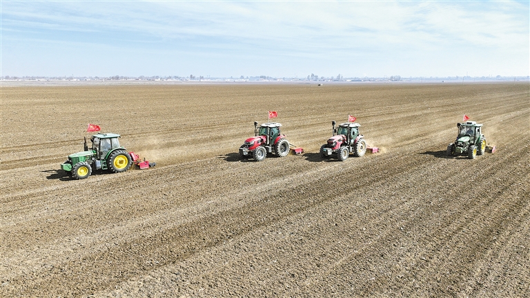 走进巴彦淖尔市杭锦后旗二道桥镇太阳升村高标准农田,播种机轰鸣作业,智能喷灌机匀速运转。