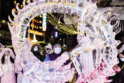 1月1日,游客在哈尔滨中央大街观赏冰雕。时下,“冰城”哈尔滨正值冰雪旅游“黄金季”。冰雪大世界高耸矗立的主塔“冰城之心”、中央大街上形态各异的冰雕、松花江畔趣味十足的冰雪嘉年华……冬日的“冰城”,城市和冰元素交融结合,焕发着独特的魅力,吸引天南海北的游客前来观赏游玩。