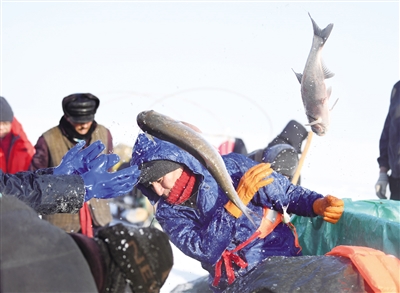 渔工们在乌伦古湖挑选捕到的鱼。新疆阿勒泰地区福海县乌伦古湖进入“冬捕”季。乌伦古湖是中国十大内陆淡水湖之一,冬季冰上大拉网捕鱼是乌伦古湖的传统捕鱼方式,场面壮观。