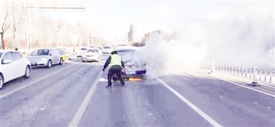 1月6日下午,一辆大众轿车沿鄂尔多斯大街由东向西行驶至展东路路口附近时,司机发现驾驶室内突然出现呛鼻的味道,并且愈发浓烈,紧接着发动机舱冒出浓烟,司机赶忙下车查看。此时路口执勤的赛罕区交管大队四中队的交警在发现这辆冒烟的车辆后,紧急联络巡逻车赶来支援并带领周边群众撤离避免发生爆炸。巡逻车值班民警迅速到达现场展开施救,他们不顾危险从巡逻车拿出灭火器开始灭火(如图)。与此同时交警不断疏散来往车辆,防止车辆爆炸波及过往群众。由于事发时风势较大,火势借助风势愈加凶猛,交警携带的两罐灭火器很快用完,但火势却没有得到控制。关键时刻,消防车赶到现场,交警一边辅助消防人员施救并对道路进行临时封闭,及时对过往车辆和围观人群进行了疏散。最终消防队员成功将火扑灭,该起事故并未造成人员伤亡。目前起火原因尚在调查之中,初步怀疑是由于车辆电路老化引起。