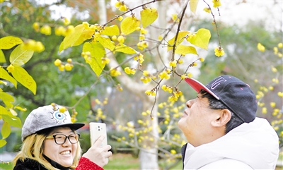 1月10日,游客在橘子洲景区梅园内嗅花香。新年伊始,湖南省长沙市橘子洲景区梅园内的腊梅凌冬盛开,花香芬芳,吸引游客驻足观赏。 摄影/新华社记者 陈振海