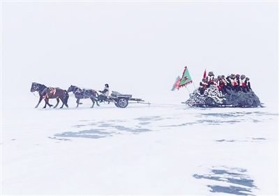 查干湖冬捕的时间是每年12月中旬到次年1月下旬,这是一年中最严寒的时候。凌晨3点,天尚未亮起来,张文就穿上羊皮袄,戴好狗皮帽子,脚踩毡嘎达(蒙古语,指靴子),和渔工们一起坐上马爬犁,拉着堆积如山的渔网还有绞盘,如长龙一般,奔向广阔的查干湖。