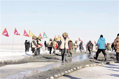 张文介绍,除了坚守这份不变的原则,查干湖每年的冬捕方式也大有讲究。每年临近12月底,当冰湖冷冻到结冰厚度超过60厘米时,冬捕的各项准备就要启动了。“‘识冰’‘镩冰’‘布网’‘出网’是每年冬捕最操劳的4件事。”谈到自己最擅长的领域,张文一下兴奋起来,“识冰就是依靠所学本领,根据冰面情况来分辨鱼群的位置,这是一门独门手艺;尔后,渔工根据我选的鱼群大致位置,测量出冰眼距离后开始凿冰眼,要手工镩出上百个冰眼后才准备下网。布网的网则由96块大网组成,总长度近2000米。”