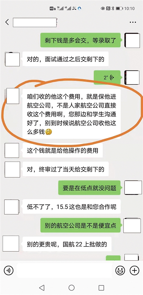 王先生给记者出示了他给办事人崔莎莎的转账记录:2019年9月2~24日,王先生分别用微信、支付宝、银行卡先后向崔莎莎转账15万元。王先生的聊天记录显示,崔莎莎和王先生说:“市面上10万元左右(安排空乘工作)都是假的,14(万元)我的价格都下不来,这样,我能再给便宜5000”“能接受的话就能走,不能的话就看别家吧……我自己的关系,我和海航的面试官直接联系。而且从我这走,你交钱什么的我全部都可以提供公司资质和合同。”2019年10月9日9时32分,崔莎莎给王先生发微信称:“王校,你安顿一下丽丽,让他(她)去体检、包括去了培训,签完(千万)别提花钱的事情,现在查的超级严,让他(她)和同学们也签完(千万)别提他(她)花钱这个事情,就当时(当是)自己面试进来的,谁也别和说,说了万一举报了就完了。”当时王先生回复“这个不会”。崔莎莎又强调一遍:“嗯,你在(再)安顿他(她)一遍,一举报证据确凿就直接回家,钱就白花了。”