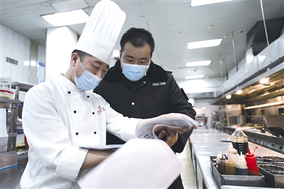 1月19日,呼和浩特市新城区市场监督管理局工作人员在内蒙古饭店检查食品留样记录。随着春节的临近,市场监管部门加大了对餐饮服务企业的监管力度。当天,呼和浩特市新城区市场监督管理局对乌兰察布西街中大型饭店的防疫措施、冷链食品的报备情况、冷藏食品的储存是否规范等进行了抽样检查。 摄影/北方新报正北方网记者 王利军