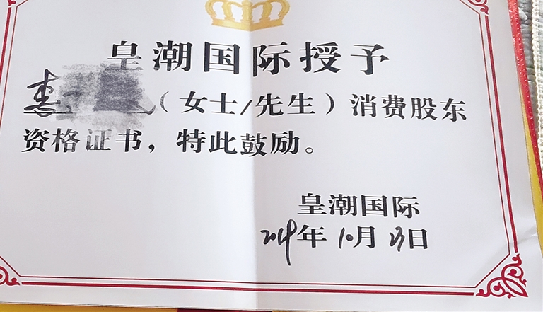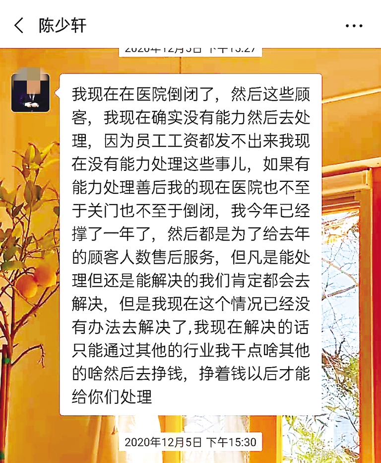 市民刘女士也同样办理了1万元的美容卡,根据她提供的“皇潮医疗美容消费股东B协议”显示,消费满1万元成为消费股东,占5股,赠送30800元整形项目现金卡,成功介绍A方案1名,还送15400元整形项目现金充值卡。协议有效期为2019年10月20日至2021年10月19日。“现在想来,他们这个消费入股的方式就有问题,纯靠介绍下线赚钱,无异于传销,空手套白狼,明显就是坑。”刘女士无奈地说,在她的再三逼问下,皇潮医疗美容院董事长陈少轩才在12月5日微信给了一份回复,称医院倒闭了,很多人员好几个月都没有发工资,确实没办法。并称目前医院已经对接了青城(妇产)医院,没做完项目的消费者可到青城妇产医院消费。