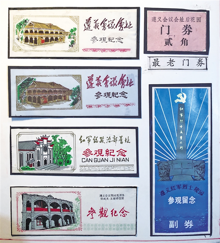 “在和全国各地藏友们交换门票的过程中,我大开眼界,也产生了为遵义会议会址设计一套新式门票的想法。”杨敏志说。1994年,遵义会议召开60周年前夕,杨敏志在征得遵义市相关部门同意后,无偿为遵义会议会址设计了一套6张的纪念门票。记者看到,这套门票分别印制着遵义会议会址、红军总政治部旧址、红军烈士陵园、娄山关等遵义红色景点的彩色照片,这些照片都是杨敏志拍摄的。照片的右边,还印制有“遵义会议 ’95六十周年纪念券”的字样。