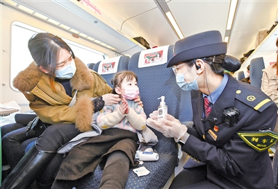 1月26日,福州南开往深圳北的D3343次列车上,乘务员在教一名小朋友用免洗消毒液进行手部消毒。2021年春运即将拉开大幕,为确保旅客出行、乘车安全,南铁福州客运段采取加强消杀等措施,做好列车疫情防控工作。 摄影/新华社记者 宋为伟