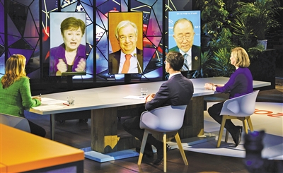 1月25日,联合国秘书长古特雷斯(中)等通过视频连线出席首届气候适应峰会。在两天会议期间,来自全球多个国家和国际组织的代表将回顾在应对极端天气和自然灾害方面所取得的进展,探讨如何进一步改善应对方法,并为今年11月召开的《联合国气候变化框架公约》第26次缔约方大会描绘路线图。(据新华社报道)