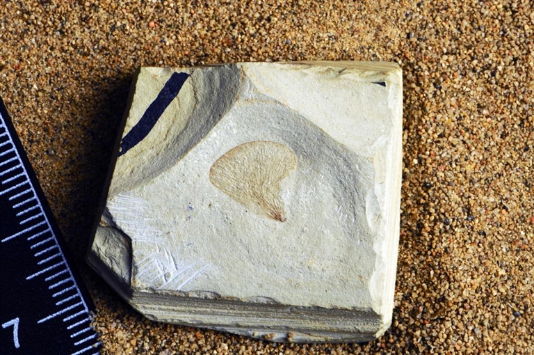 在中科院植物研究所中国古植物馆,记者看到了这块苹属化石的“真容”:半个巴掌大的灰白色化石上,一片和指甲盖差不多大小的扇形痕迹清晰可见。