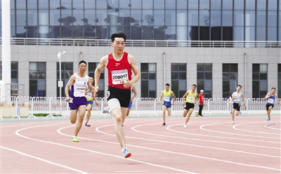 6月1日,选手在比赛中全力冲刺。5月31日晚,2021年内蒙古自治区大学生田径锦标赛在内蒙古财经大学开幕,来自全区17所本科院校、26所高职高专院校的裁判员、教练员、运动员齐聚该校西校区体育场,唱响青春欢歌,见证运动魅力。本次比赛历时4天,共设置本科超级组42项、本科校园组38项、高职高专组33项竞赛项目,有近千名运动员参赛。 摄影/北方新报正北方网记者 牛天甲