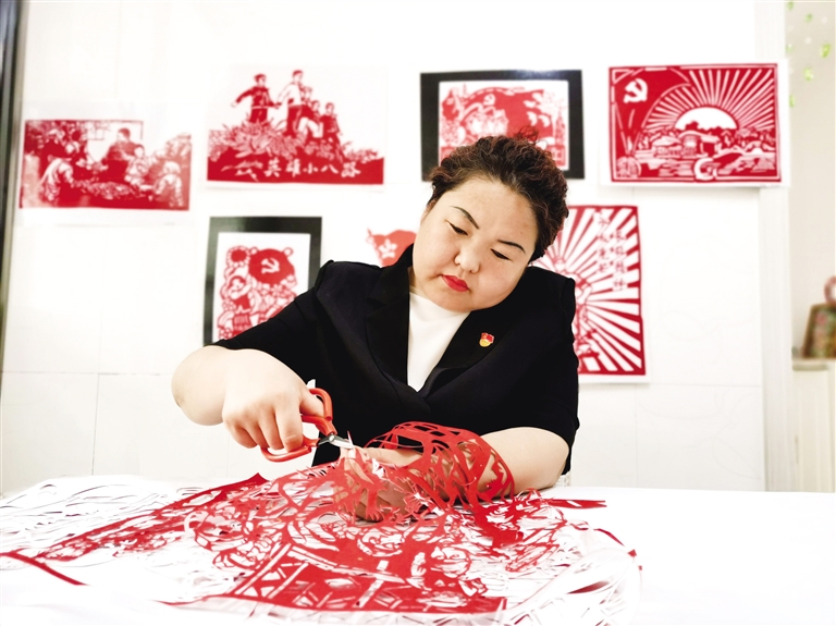 乌日财胡是一名80后美术教师,从小热爱美术,酷爱剪纸。记者见到乌日财胡时,她正在创作“庆祝中国共产党成立100周年”的剪纸系列作品。左手一张红纸,右手一把剪刀,纸屑在剪刀的上下翻飞中纷纷飞落。
