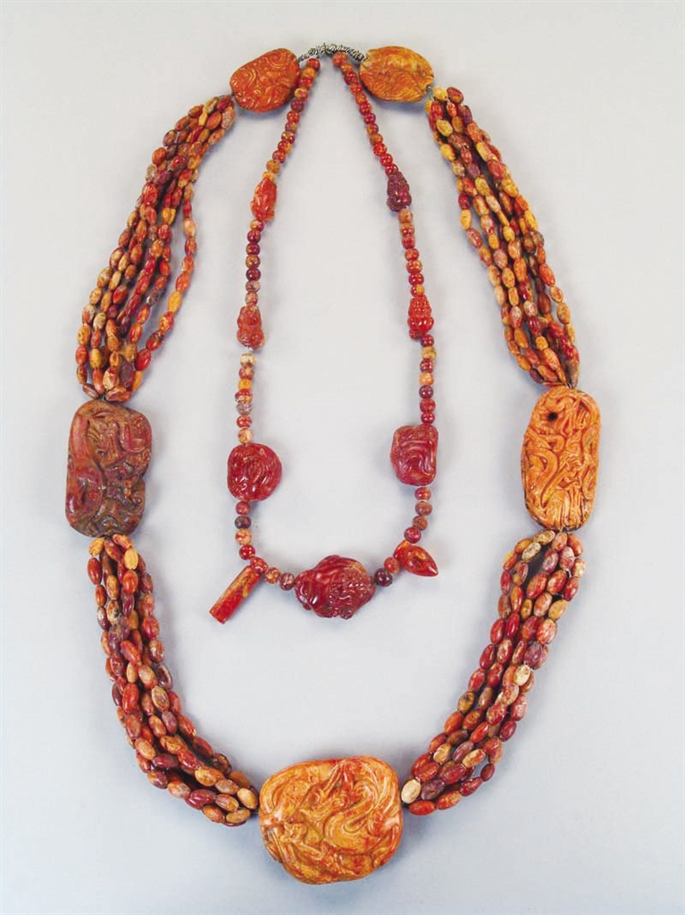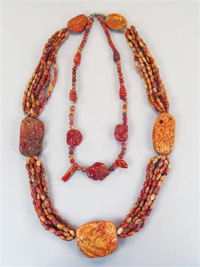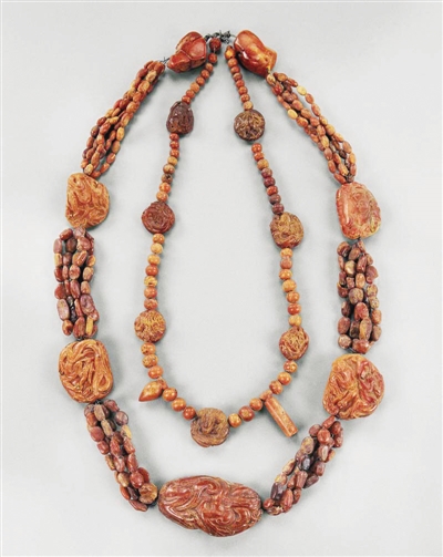辽代贵族墓中发现大量以琥珀作为首饰的主要材质,其数量和质量是历史上任何朝代都无法与其比拟的。史料记载,我国对琥珀的使用可以追溯到距今三千年前的四川广汉三星堆遗址时期,在以后历代都有出现过,但数量很少,唐代仅有三处遗址出土琥珀制品,宋元出土的琥珀制品亦屈指可数,这与辽代大规模使用琥珀制品形成了鲜明对比。