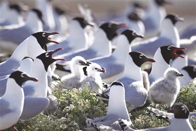 6月2日,遗鸥在红碱淖的鸟岛上栖息。近期,随着气温升高,陕西省神木市红碱淖湿地保护区成了遗鸥的乐园,遗鸥在这里觅食嬉戏、孵化后代。 摄影/新华社记者 陶 明