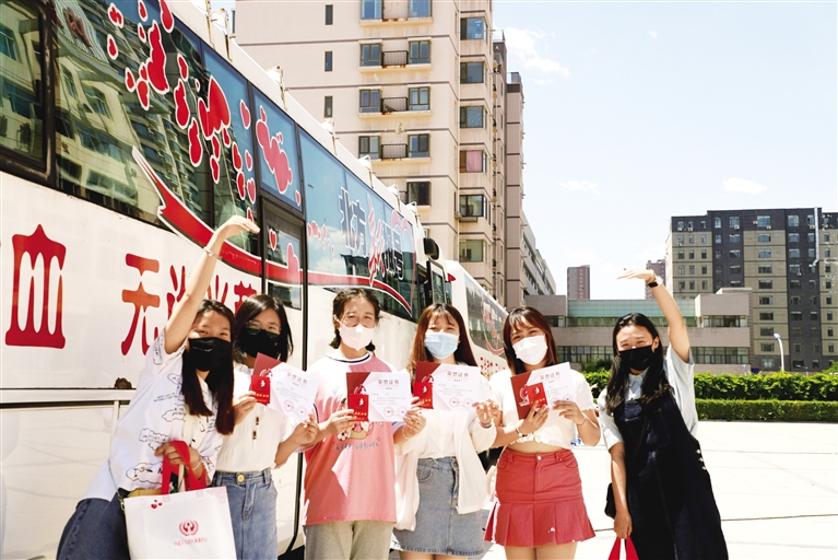 为迎接6月14日“世界献血者日”的到来,由内蒙古血液中心、北方新报社联合主办,公益联盟志愿服务队协办的“参与无偿献血 共筑健康中国”大型献血活动6月5日在内蒙古血液中心举办,图为参加无偿献血的大学生在“北方新报号”献血车前开心留念。来自多所高校的大学生以及公益组织的爱心人士积极响应,当日共计240人成功捐献全血76400毫升,血小板31个单位。 摄影/北方新报正北方网记者 王利军