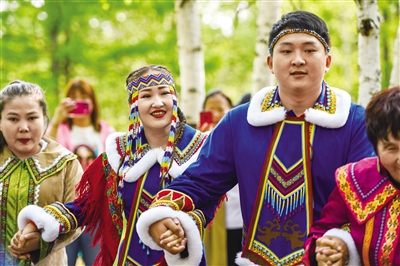 新郎新娘在鄂温克族传统居所“撮罗子”前举行祝福仪式
