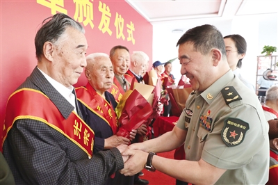 6月11日下午,内蒙古军区在呼和浩特第二离职干部休养所举行“光荣在党50年”纪念章颁发仪式,为38名党龄满50周年的老党员代表颁发纪念章并敬献鲜花。据悉,内蒙古军区近期将广泛开展“向老党员学习”、重温入党誓词、党史知识竞赛等活动,激励全区官兵、文职人员和职工,传承红色基因,赓续优良传统,矢志强军打赢,为筑牢祖国北疆安全稳定屏障作出新的更大贡献。 文/北方新报正北方网记者 郑慧英 摄影/靳浩阔