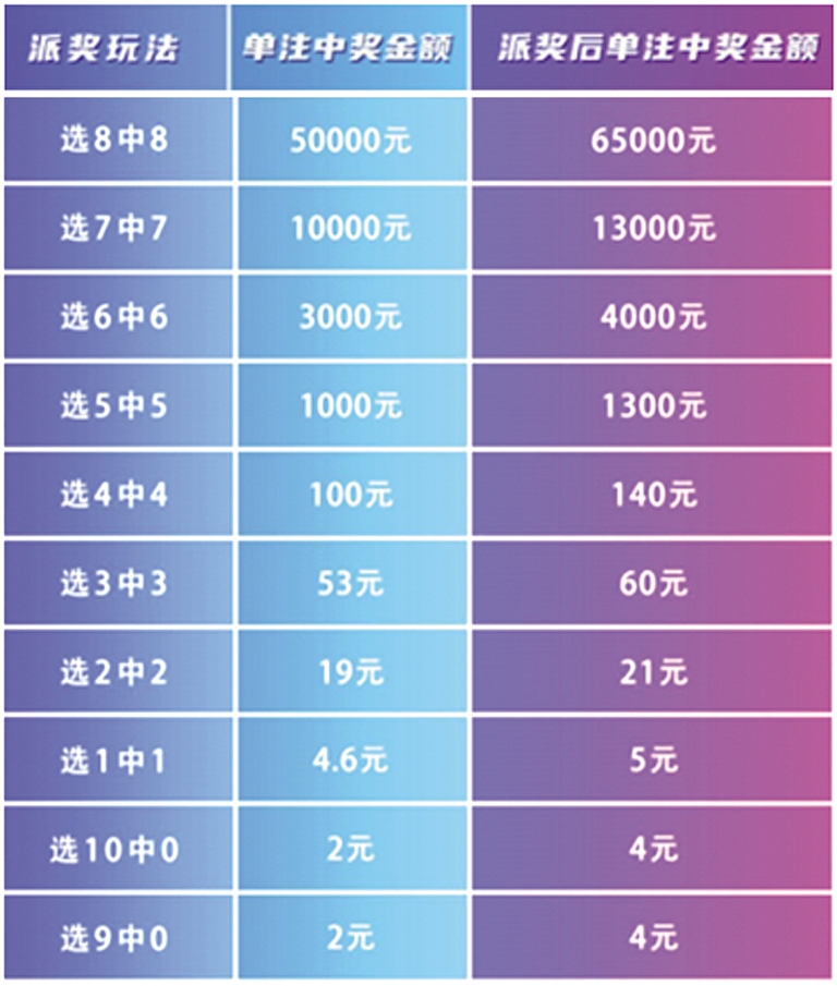 本次派奖分为:全玩法奖上奖、“选十中十”翻番奖和“选九中九”翻番奖。