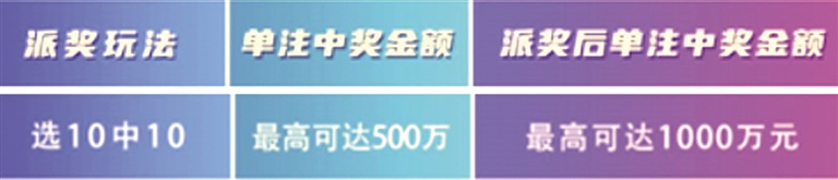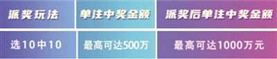 “选十中十”翻番奖。前16期每期安排500万元,奖金总额8000万元,用于设立“选十中十”翻番奖,由选十玩法“选十中十”奖等按照中奖注数均分,“选十中十”翻番奖单注奖金封顶500万元。若当期“选十中十”奖等未中出或“选十中十”翻番奖奖金有结余的,则顺延滚入下一期,与下一期“选十中十”翻番奖奖金合并派发。以此类推,直至“选十中十”翻番奖奖金派送完毕为止。