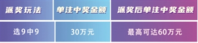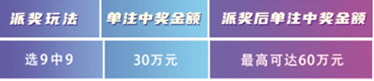 “选九中九”翻番奖。每期安排150万元,奖金总额4500万元,用于设立“选九中九”翻番奖,由当期选九玩法“选九中九”奖等按中奖注数均分,“选九中九”翻番奖单注奖金封顶30万元。若当期“选九中九”奖等未中出或“选九中九”翻番奖奖金有结余的,则顺延滚入下一期,与下一期“选九中九”玩法翻番奖奖金合并派发。以此类推,直至“选九中九”翻番奖奖金派送完毕为止。