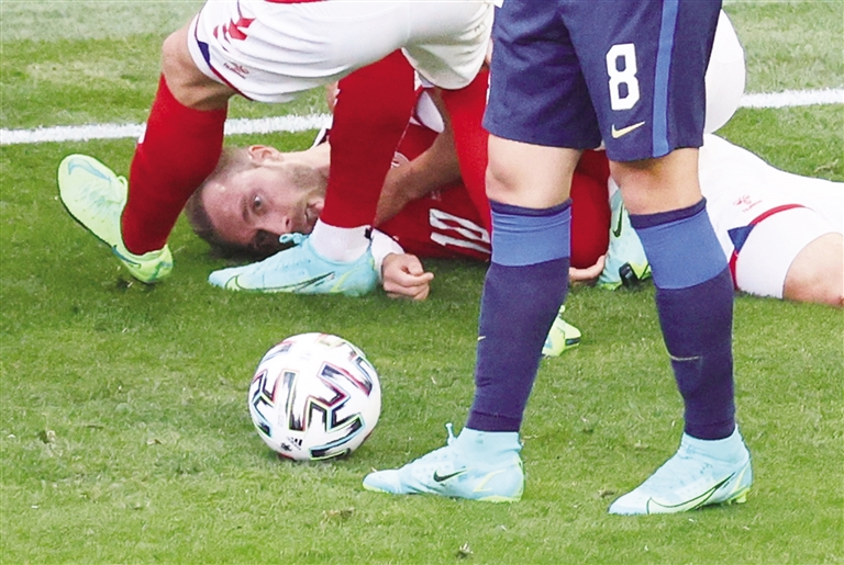 这场比赛,丹麦队占据优势,但第43分钟,在边路进攻时,丹麦队核心、效力于国际米兰的埃里克森突然倒地,不省人事。这一突发情况让比赛不得不中止。丹麦球员围拢过来,芬兰队员也停下了脚步。场边,埃里克森的妻子泣不成声。丹麦队长克亚尔反应很快,他蹲下身查看埃里克森有没有呼吸,是否咬断舌头,并抢在队医赶到前,俯身给埃里克森做心肺复苏。而其他队友在队长的指挥下,马上围成一个圈,形成简单的保护墙。随后,队医赶到,给埃里克森做了检查后马上将其抬上救护车,送往附近的医院抢救。