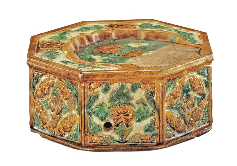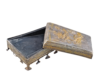 此砚盒造型优美,装饰华丽,采用鎏金錾花工艺制作而成。金花银是银器制作工艺的一种,先在银器上錾出图案,后在图案上鎏金,这样既突出了图案,又产生了黄白相间、相互映衬的视觉效果,工艺虽显繁缛,但可使银器富丽堂皇,富有立体感,是极为难得的珍稀之物。