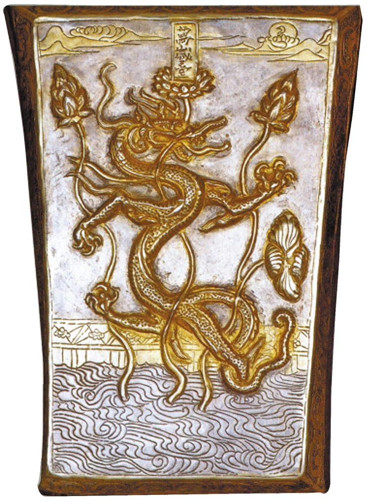 金花银龙纹“万岁台”砚盒盖正面为栖顶式样,凹凸有形,错落有致:下端錾刻波涛,翻滚奔腾,蓄势待发;中部横冲腾龙,曲身回首,虬髯飘逸,极具视觉冲击力;三枝立莲穿绕于龙身,其中一朵盛开,经龙嘴衔立于龙头顶部,花蕊之上竖刻“万岁台”三字;上端錾刻远山浮云,一轮骄阳冉冉升起,恰似契丹政权悄然兴起于北方大漠,焕发着勃然生机。盒盖四边錾刻牡丹、忍冬卷草花纹。盒内为箕形石砚,内装毛笔两支,毛笔上饰银箍,亦錾图案,应为耶律羽之生前使用的物品。