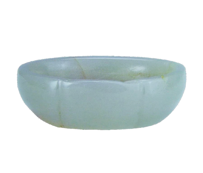 风字形玉砚平面呈风字形,墨池为斜面,前部有两个矮足。一件长12厘米、宽7.1厘米、厚2.6厘米、足高0.8厘米;另一件长8.5厘米、宽5.2厘米、厚1.9厘米、足高1.1厘米。玉水盂形制为椭圆形口作四出花瓣形,弧腹,平底,高 2.3厘米。