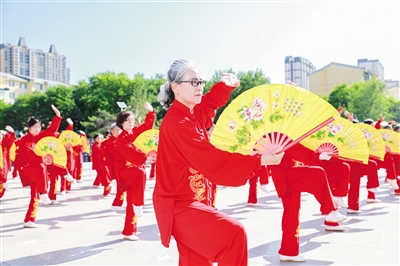 6月22日,呼和浩特市新城区健身爱好者正在进行太极扇展演。当日,由内蒙古自治区体育局机关第五党支部和自治区社会体育服务中心党总支联合举办的庆祝中国共产党成立100周年全民健身展演暨党史学习教育主题党日活动在人和小区举行。来自新城区的400余名健身爱好者进行了健身气功、太极扇、健身操、唱红歌等项目的展演,演出过程中还穿插进行了党史知识问答。 摄影/北方新报正北方网记者 牛天甲
