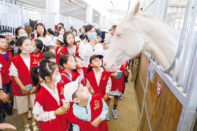 参观中,小记者们认真听讲,仔细观察,并纷纷掏出笔记本做好记录,随时和讲解员互动,更有小记者在讲解员的指导下,轻轻抚摸了马匹。“这里的马又好看又可爱,我忍不住想摸一下。”来自腾飞路小学一年级(2)班的李怡可大胆抚摸了她喜欢的马匹。